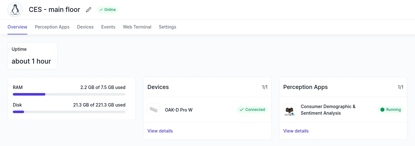 Device 是指安装OAK Hub Agent的物理机或虚拟机. 它充当边缘AI应用程序的工作核心, 提供详细的insights, 例如 内存, 硬盘占用, 连接的OAK相机和安装的程序的状态. 关键功能包括:- 可视化地得知设备可以访问哪些OAK相机.