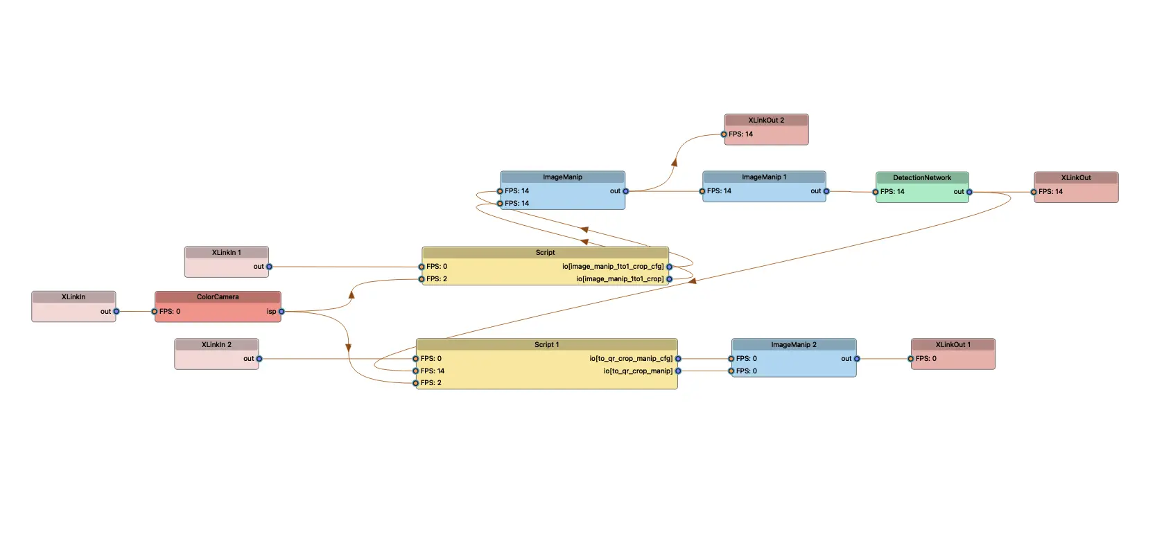 - Frame Rate: 因为在 OAK-1 MAX上的5312x6000 分辨率, 应用程序最高运行速度为 2 FPS. 在 4K 分辨率下, 该应用程序运营速度为 3.3 FPS, 分别对应于 18 FPS 和 30 FPS 的神经网络推理速度. 在本应用程序中使用的 QR code 检测神经网络(YOLOv8) 最高可达 30 FPS.