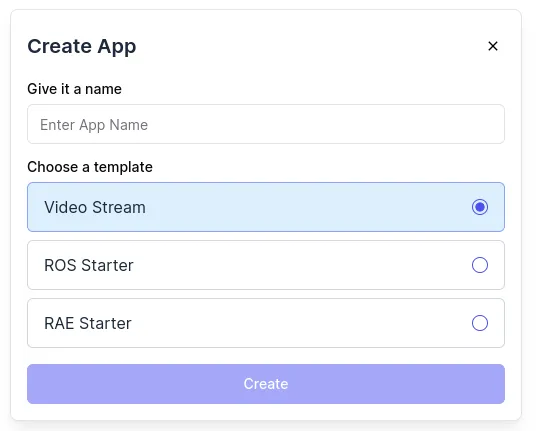 Apps.点击 Create App 然后填写名称. 然后选择一个 available templates (如果不知道就选 Video Stream).