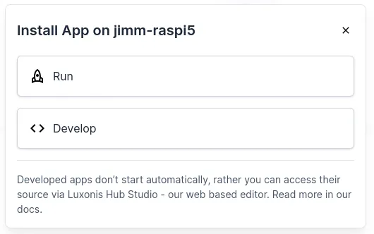 Device 详细信息. 点击 Apps 然后点击 Install App. 在对话窗选择 Develop.