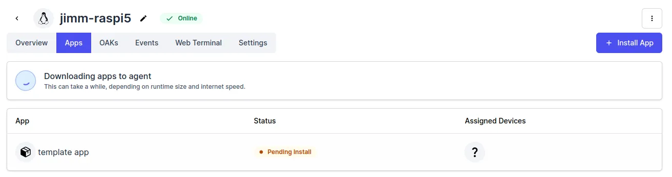 选择您刚刚创建的应用程序和唯一可用的版本.选择您想要使用开发的 OAK 设备然后点击 Install with selected.