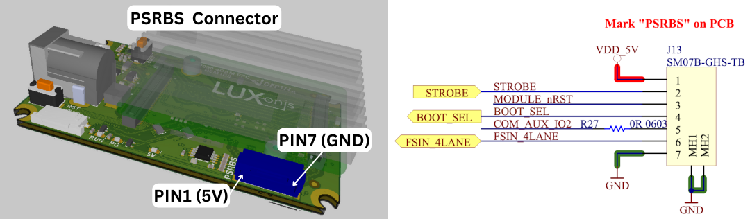The OAK-FFC-4P has a PSRBS connector, which allows users to easily connect the OAK camera to the external logic. You can use [PSRBS cable] to connect to this connector.