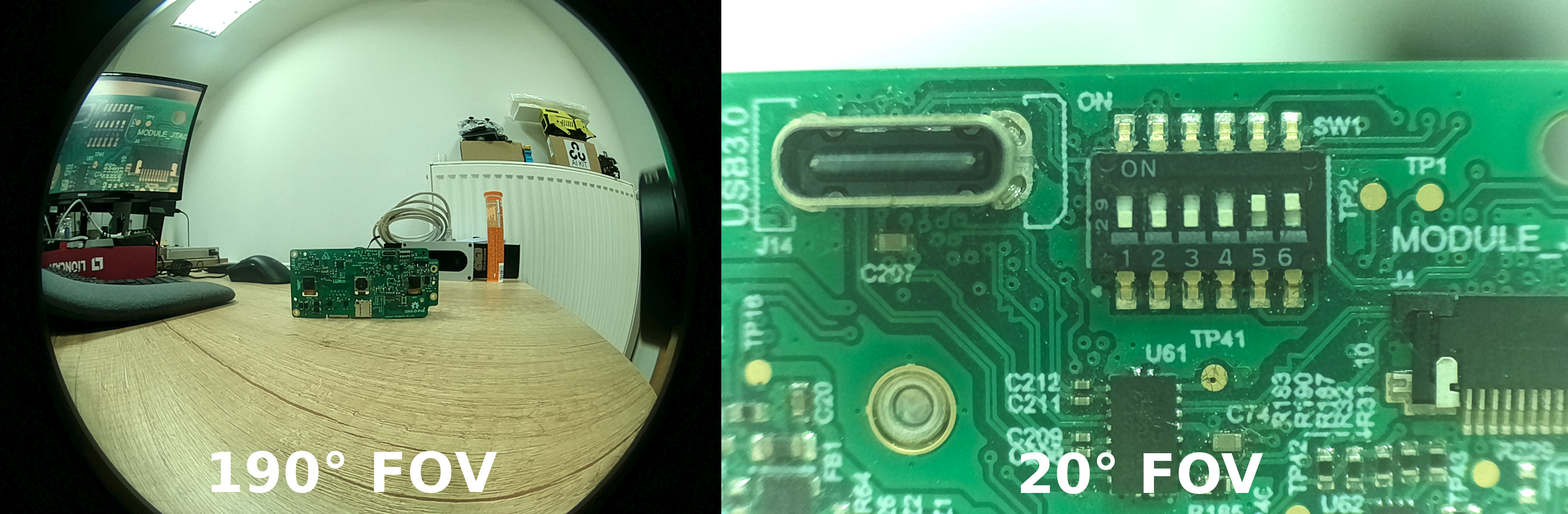 Tests were done using 2x OAK-FFC-IMX477-M12 and two different M12 lenses: 20° FOV and 190° FOV.Side-by-side comparison of narrow and wide FOV M12 lenses on OAK-FFC-IMX477-M12:
