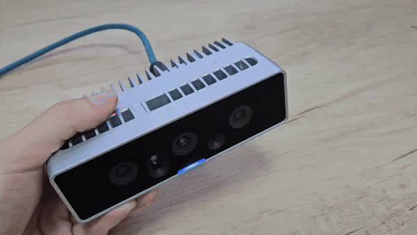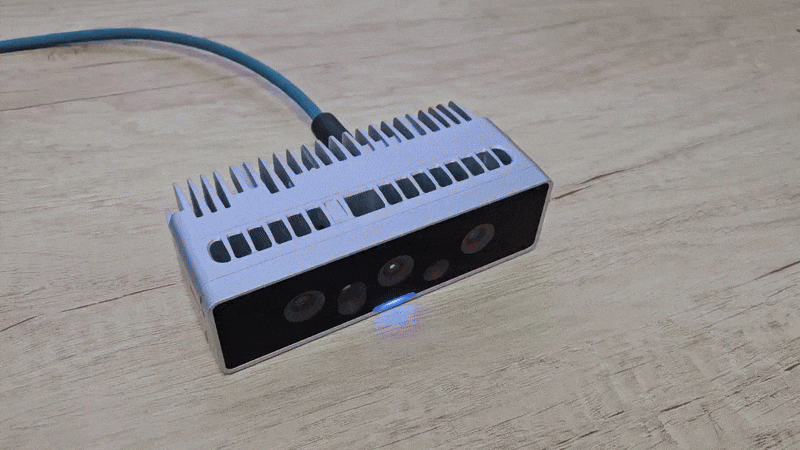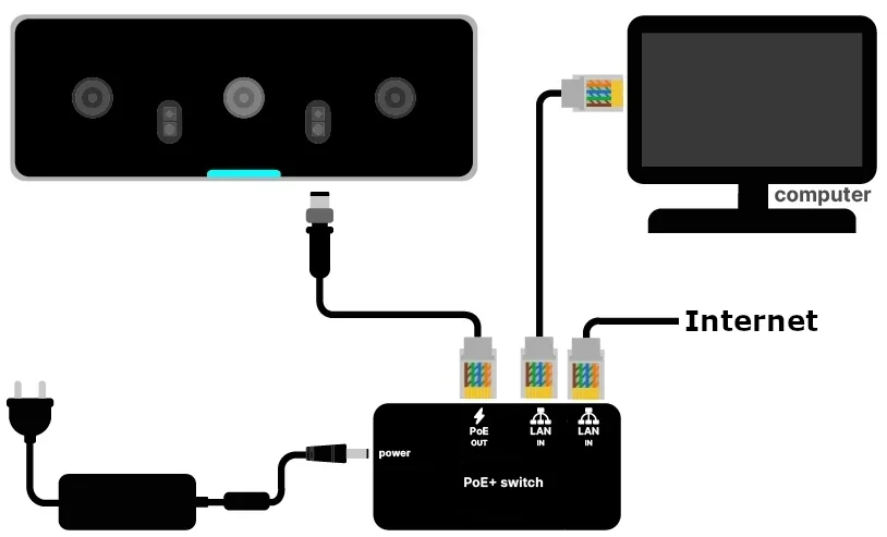 OAK4 cameras consume up to 25W of power (peaks) and require PoE+ (802.3at, 30W) injector/switch for power . After being powered and booted, status LED should turn blue and start "breathing", indicating that the device is ready for configuration.