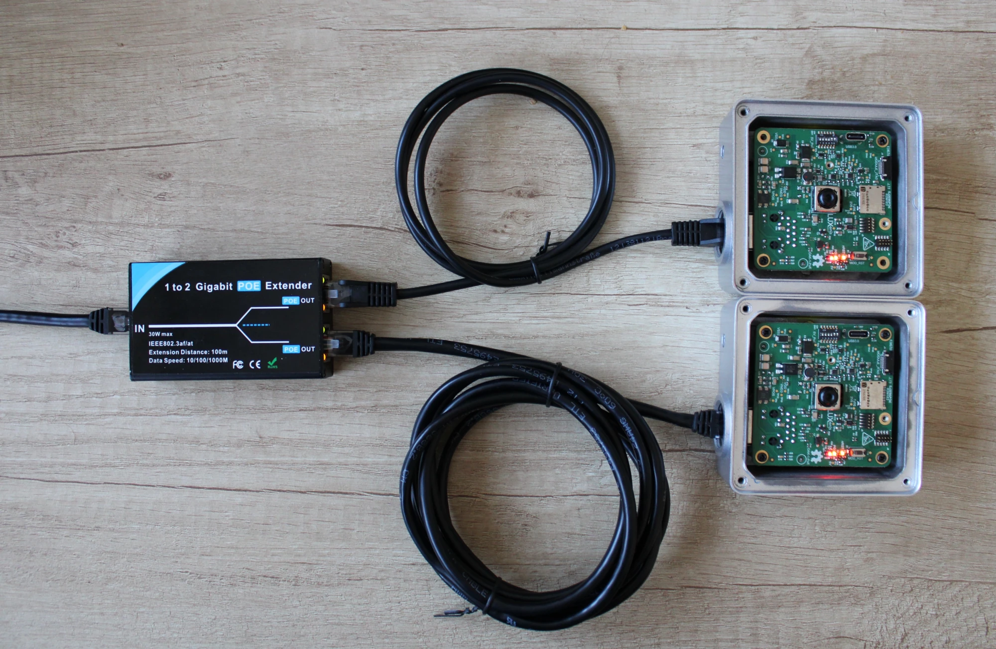 We have tested the power/communication with this PoE extender. It's a 1Gbps extender that accepts PoE+ (30W) and has 2x PoE (15W) port outputs, so you can connect two OAK PoE cameras to it.