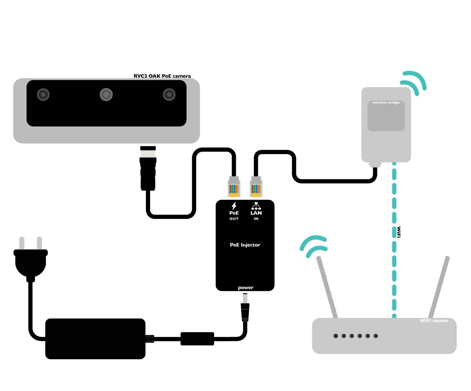One option to connect the PoE device to the network is to use a WiFi bridge. This is useful when you don't have a PoE switch or injector, but you have a WiFi network available. The bridge will connect to the WiFi network and provide an ethernet port (connectivity) to your OAK PoE device. We have tested the Vonets WiFi Bridge and it works as expected.You first need to connect to the WiFi bridge (eg. via your phone) and configure it to connect to your WiFi network. Then you can connect the OAK PoE device (via PoE injector) to the bridge.
