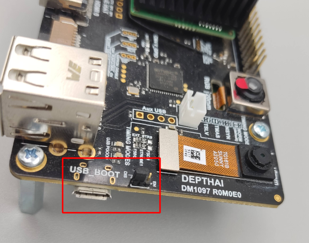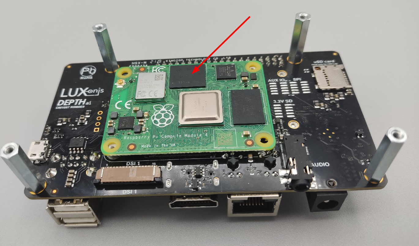 OAK-D CM4 and OAK-D CM4 PoE have Raspberry Pi Compute module 4 (CM4) on-board. Most OAK-D-CM4 batches have CM4 with an eMMC memory on there, and most OAK-D CM4 PoE boards have CM4 Lite, which doesn't have eMMC memory, but instead boots from the uSD card. It's straight forward how to flash an image to the uSD card, and here we will go through the process of flashing an image to the eMMC that's on the CM4.Here's an OAK-D-CM4, which has CM4 with eMMC memory that is indicated by the red arrow. CM4 Lite versions won't have this chip in that location.