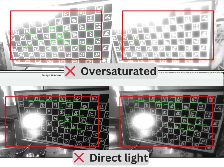 When displaying the charuco board, markers and squares should be sharp and clearly visible. Keep in mind:- Avoid too bright or dim screens.