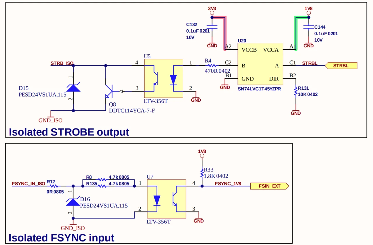 External triggering: Sensors require 1V8 rising edge on FSYNC for the trigger event. We are using an optocoupler and ESD protection diode, so the input trigger voltage should be 12V (up to 24V) and the trigger logic is reversed, so trigger event happens at 0V on the FSYNC line. For an example, see External FSYNC Example.