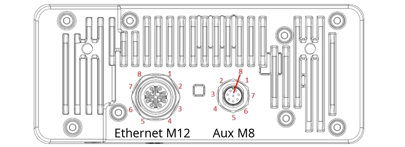 M8 aux connector has 8pin female A-coded connector and the M12 ethernet has 8pin female X-coded connector. Cameras also include an M8 connector cap for waterproofing in case the M8 connector wouldn't be used.