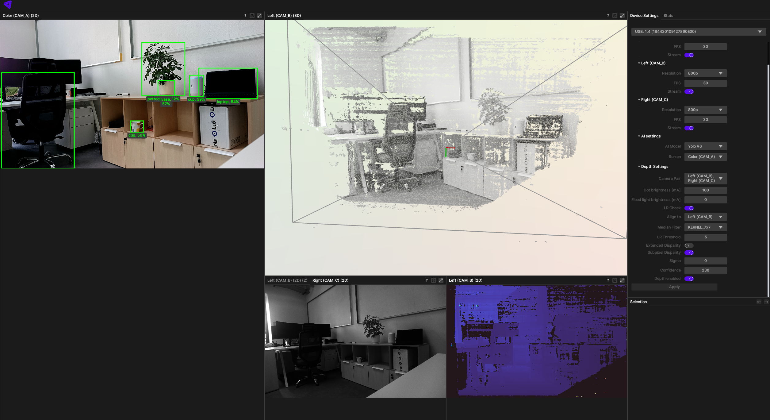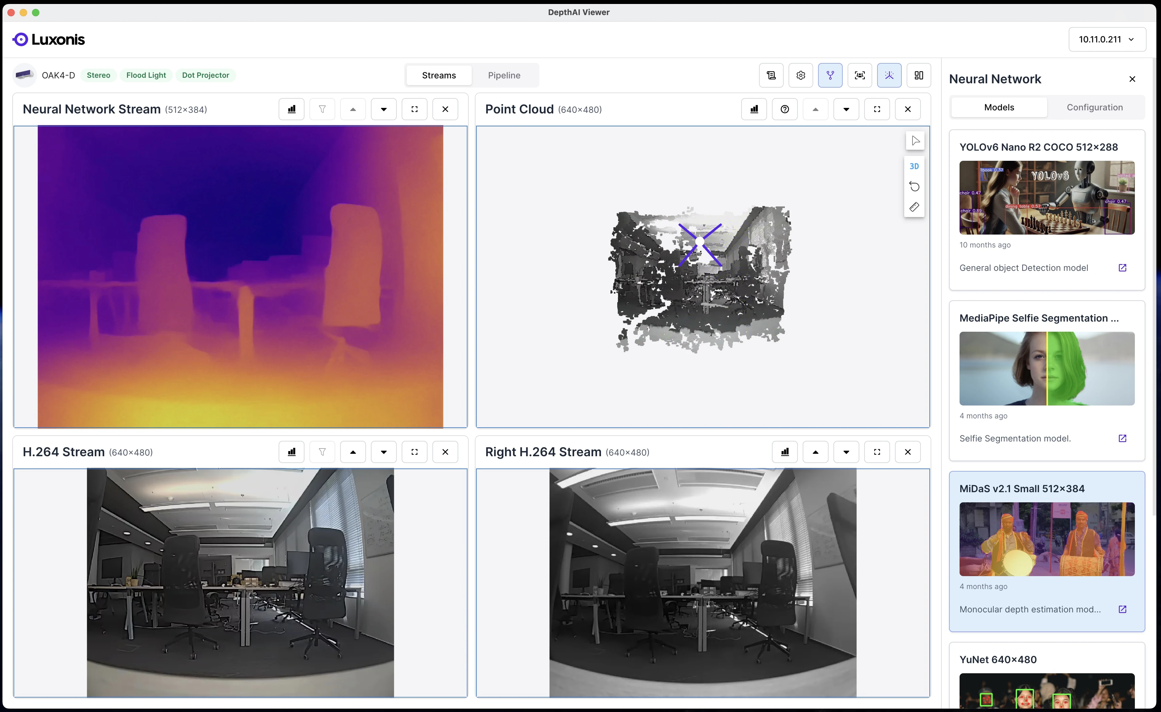 OAK Viewer is a desktop GUI application that allows you to visualize the camera's streams and interact with the device. It is available for Windows, macOS, and Linux.