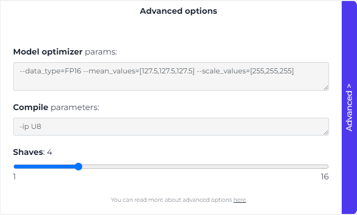 .onnxfile and enter any necessary Model Optimizer parameters in the 'Advanced' settings. --data_type: Set to 'FP16' for compatible precision with the VPU processor.--mean_values: Set to [123.675, 116.28, 103.53]. These values correspond to the average of the red, green, and blue channels across all images in the ImageNet dataset (on which ResNet18 was trained).--scale_values: Set to [58.395, 57.12, 57.375] which are the standard deviations of each channel. This scaling ensures that the range of pixel values in the input image matches the range in the training data, which is important for the model to perform correctly.--reverse_input_channels: Use this flag to switch from BGR to RGB, since theCameranode outputs frames in the BGR format, and the model requires RGB images.- So at the end, the flags should look like this: