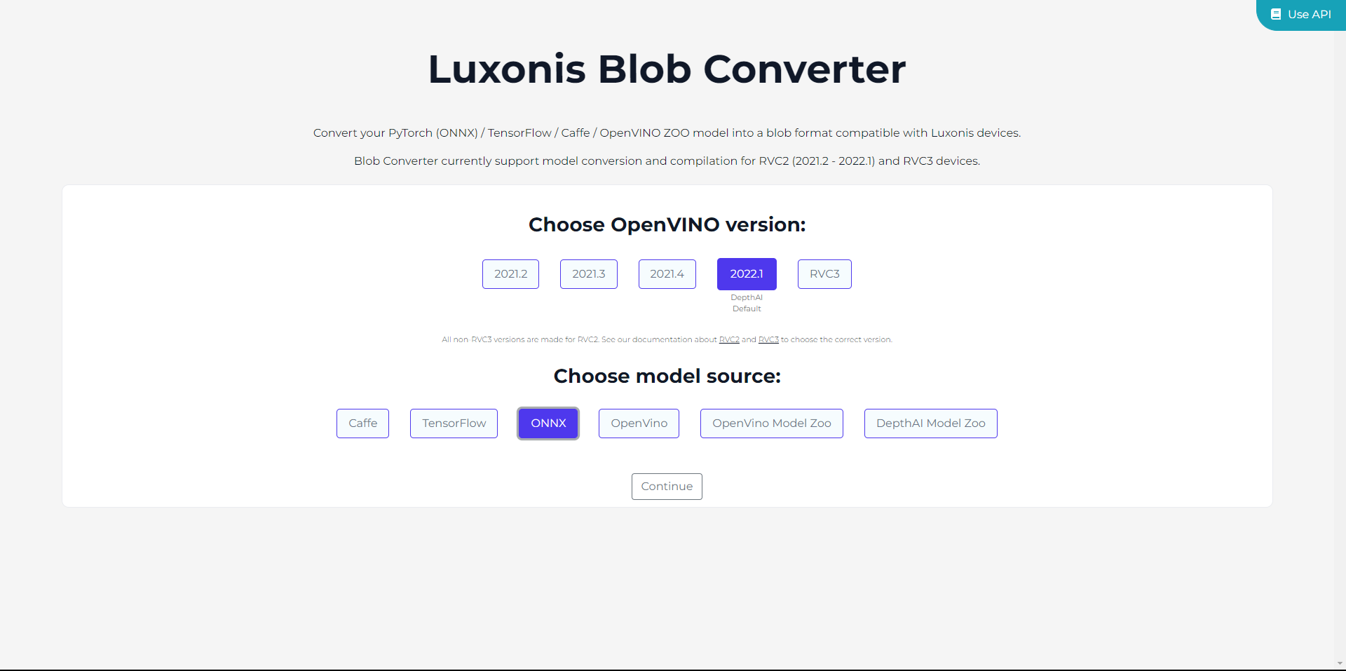 2022.1. For RAE and other devices with RVC3, you can simply pick RVC3. After choosing the version, indicate the model source. In our case, the ONNX Model, but it is also possible to upload your model in the IR format. Then click onContinue.