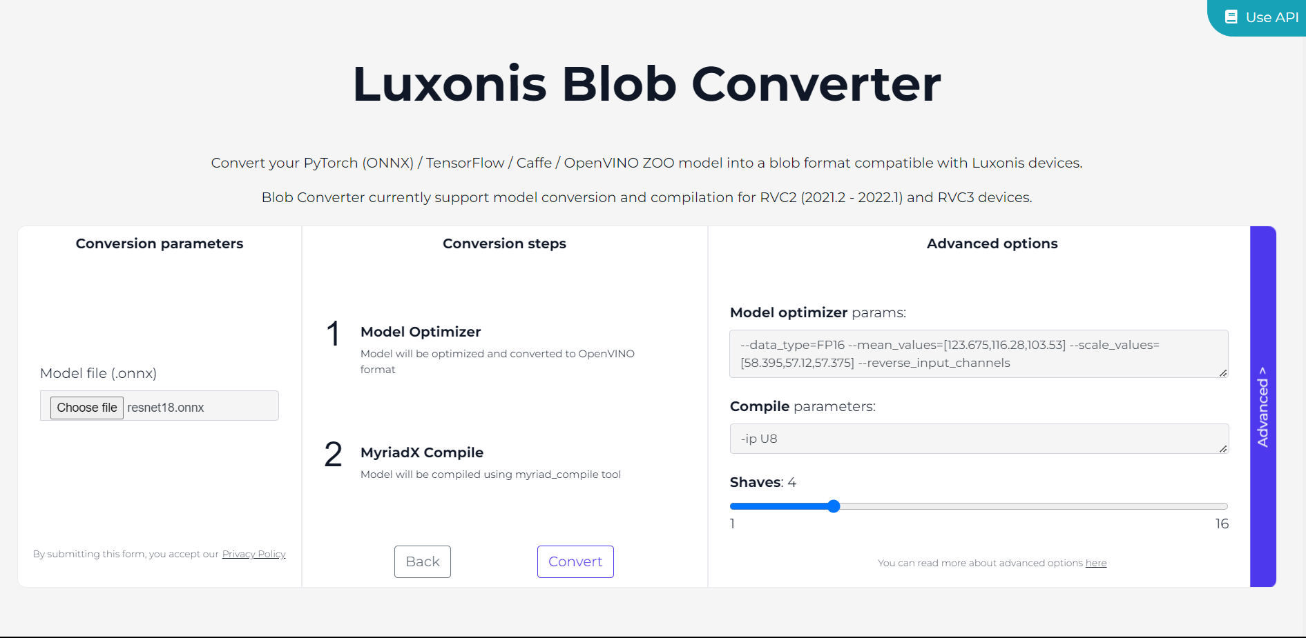 Alternatively, you can use the BlobConverter API, which is particularly useful for automated workflows. This can be done by making HTTP requests to the BlobConverter service with the necessary model and parameters. You can find more information on how to do this by clicking on theUse API button at the top right corner of the website.Note: The BlobConverter tool can also be self-hosted. For guidance on this process, please refer to the instructionsavailable in our BlobConverter repository.