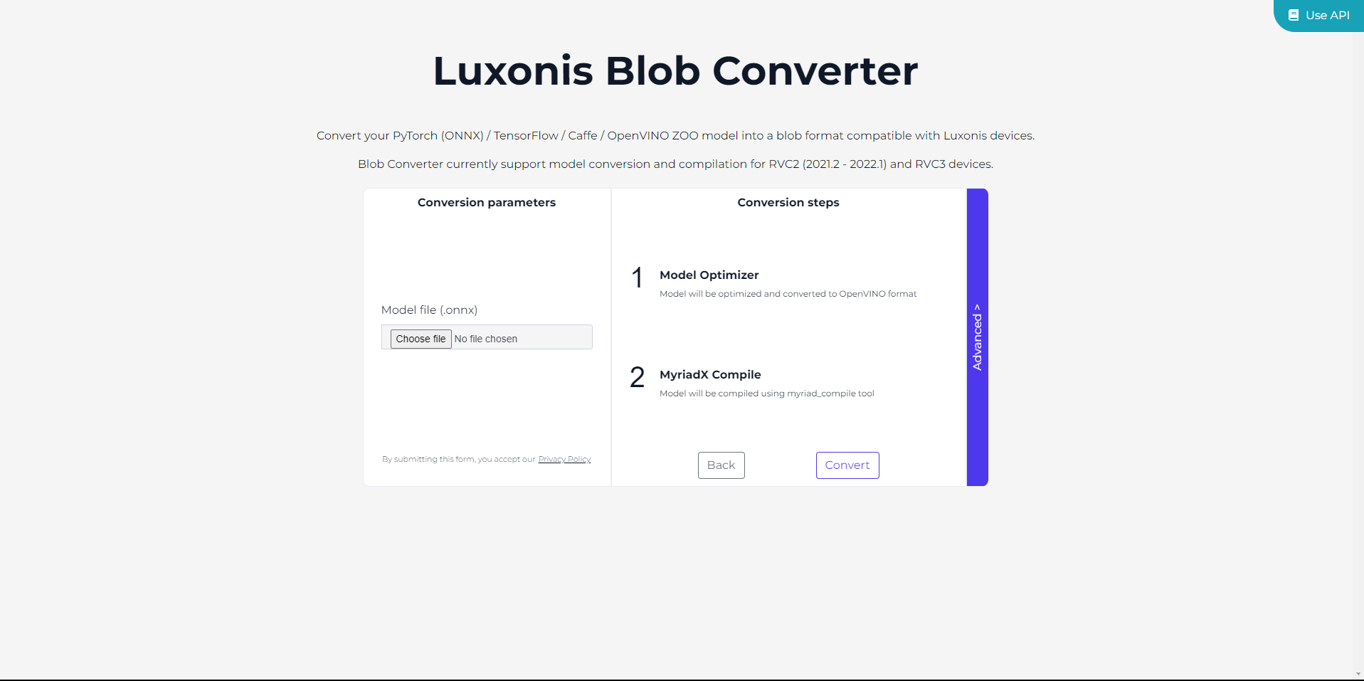 The BlobConverter is our open-source tool that supports conversion to a RVC (.blob) format compatible with RVC2 and RVC3 OAK devices. The tool is accessible through a web interface and an API. This section guides you through all the conversion options.Conversion