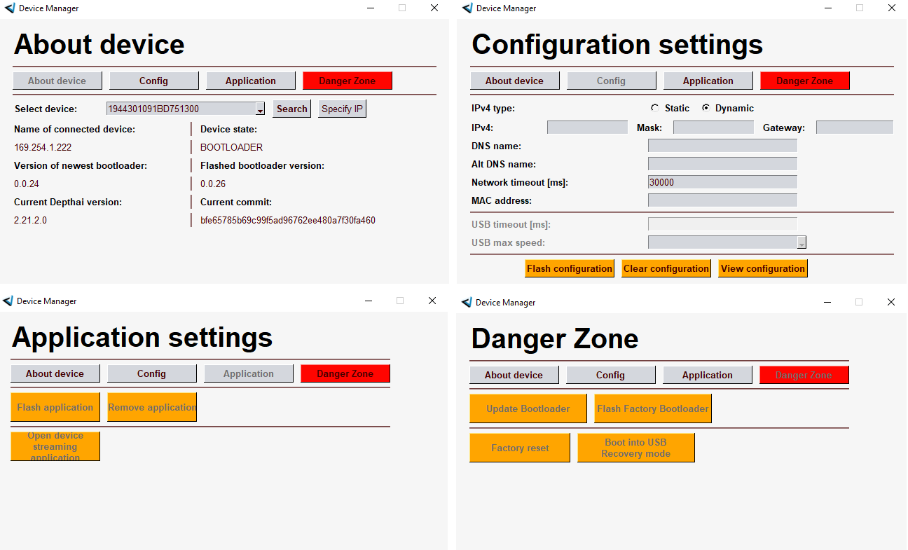 DepthAI bootloader is a small program which handles the booting process, either by booting the flashed application (see Standalone mode), or by initializing the OAK PoE camera so DepthAI API can connect to it. OAK PoE cameras already come with factory bootloader flashed at the factory.Bootloader is bundled inside with thedepthai library, so to eg. flash the newest bootloader, you should use the newest depthai library.Device Manager