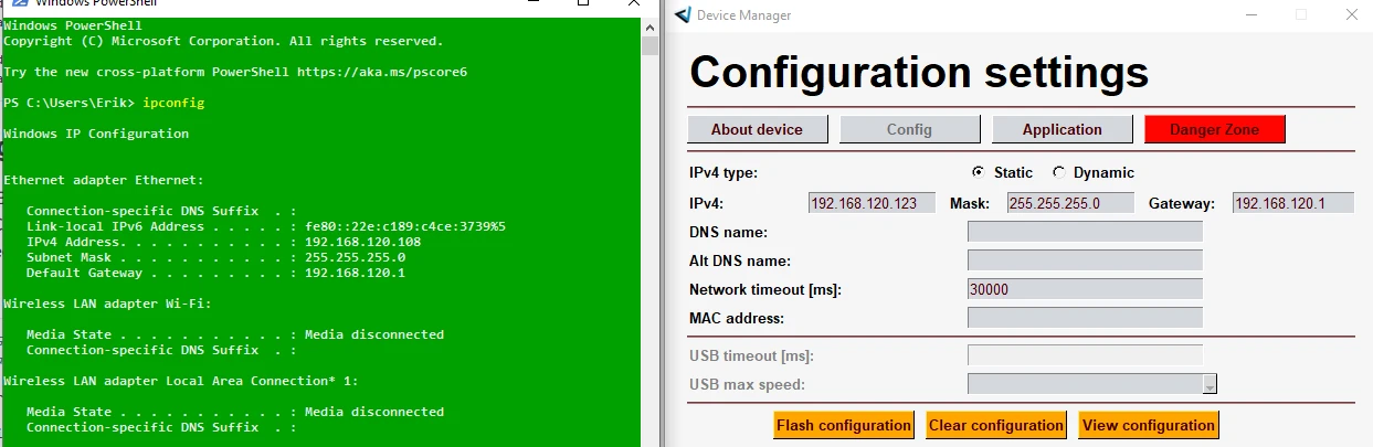 After you select a device that has bootloader flashed, you can also configure bootloader configuration.- If the device has NETWORK bootloader flashed, you will be able to set its static/dynamic IP/mask/gateway, DNS, MAC, etc.