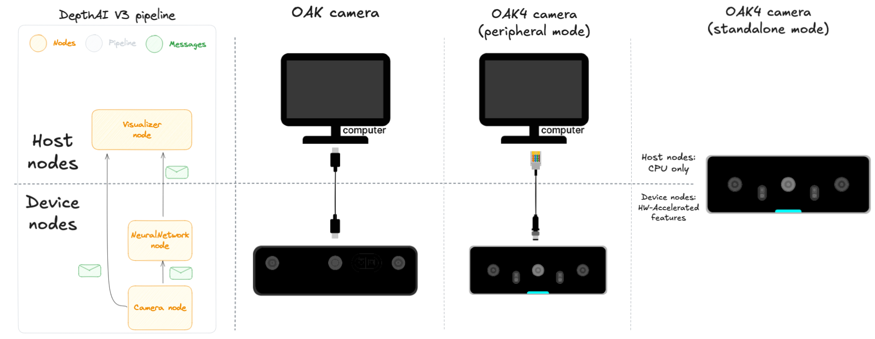 - on RVC4 devices (OAK4-S, OAK4-D) - host side depends on the mode the device is running in. In peripheral mode, the host is the device connected to the DepthAI device via USB - the same as RVC2 devices. In standalone mode, the OAK4 device itself is the host (running Linux) and the host nodes run on the device CPU (see image below).