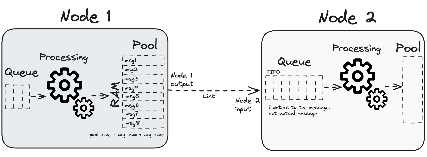 Node outputs Messages. Some nodes have a configurable output message pool. Output message pool is a reserved memory region (to reduce memory fragmentation) that holds output messages. After the node creates an output message (for example ImgFrame), it will send it to other nodes as specified when linking the inputs/outputs of the node. Currently, some nodes (VideoEncoder, NeuralNetwork, ImageManip, XLinkIn) can have the pool size configured. The size of the pool specifies how many messages can be created and sent out while other messages are already somewhere in the pipeline.Pipeline freezing