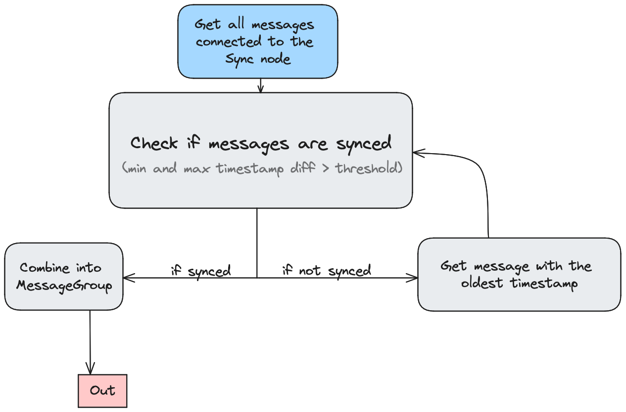 The Sync node aligns incoming messages based on their timestamps. The synchronization criteria and behavior can be configured using thedepthai.node.Sync.setSyncThreshold and depthai.node.Sync.setSyncAttempts method. More info in the Reference section.Sync Logic