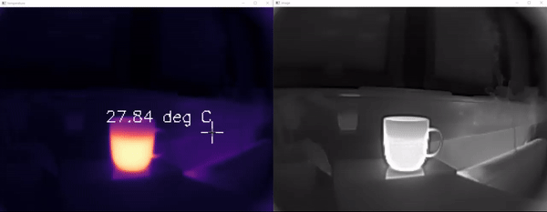 The example uses DepthAI to process and display thermal camera data, showing a colorized temperature map and raw thermal image side-by-side, with a mouse-controlled crosshair displaying real-time temperature readings in degrees Celsius.This example requires the DepthAI v3 API, see installation instructions.Demo