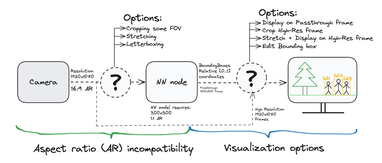 A challenge occurs when your NN model expects a different aspect ratio (eg. 1:1) compared to the sensors aspect ratio (eg. 4:3), and we want to run NN inference on the full FOV of the sensor. Let's say we have a MobileNet-SSD that expects 300x300 input frames (1:1 aspect ratio), and we want to run inference on full FOV of the sensor - we have a few options:- Crop the ISP frame to 1:1 aspect ratio and lose some FOV