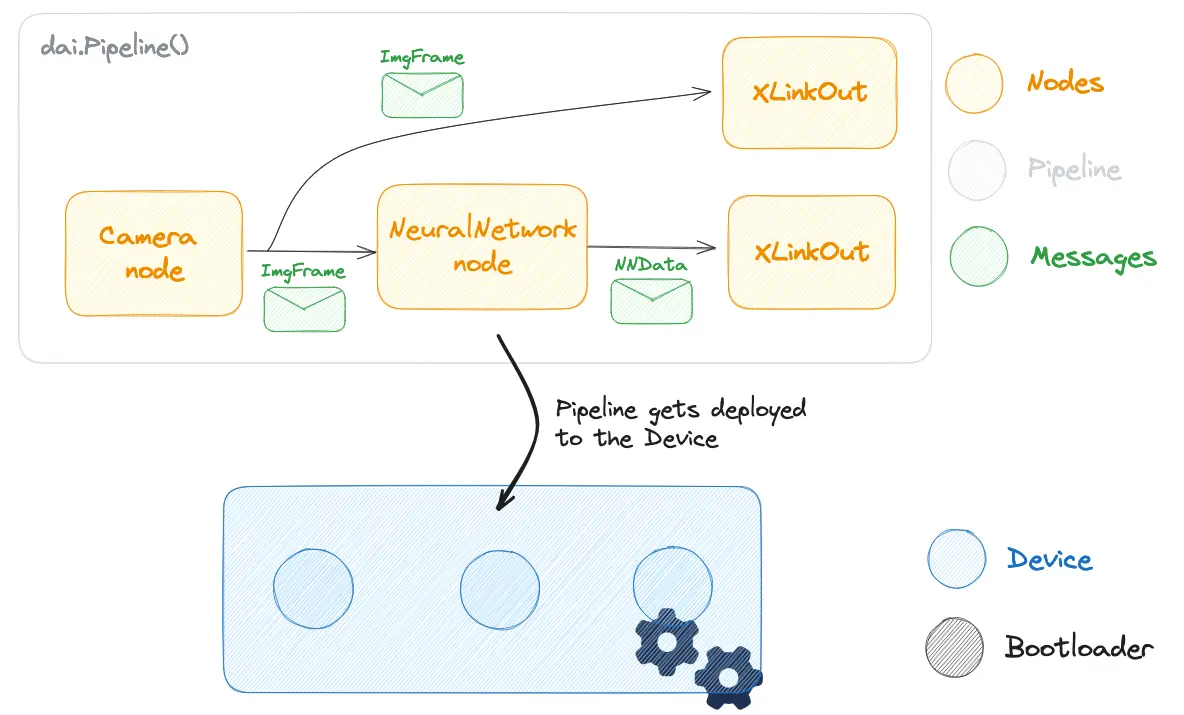 - Pipeline consists of linked nodes and gets deployed to the device where it runs on accelerated hardware blocks