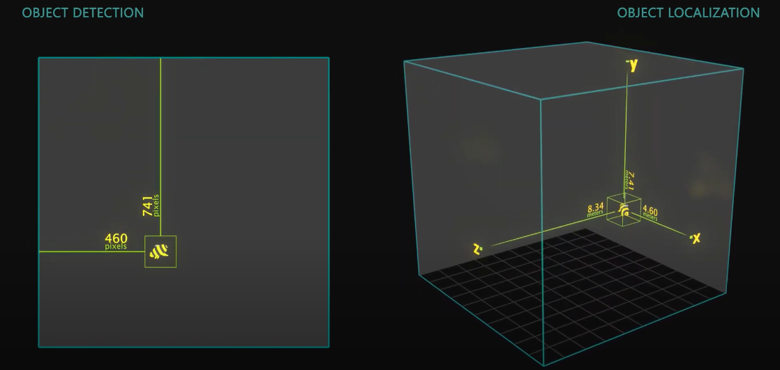3D Object Localization (or 3D Object Detection) is all about finding objects in physical space instead of pixel space. It is useful when measuring or interacting with the physical world in real-time.Below is a visualization to showcase the difference between Object Detection and 3D Object Localization: