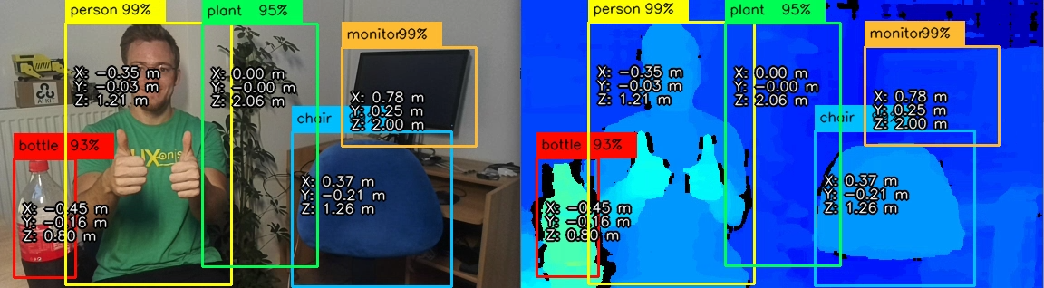 In the image above, a DepthAI application runs a MobileNet object detector on RGB camera stream and fuses them with the depth map [RGB-D] to estimate the 3D position of each detected object (see MobileNetSpatialDetectionNetwork node for more details).NeuralNetwork decoding