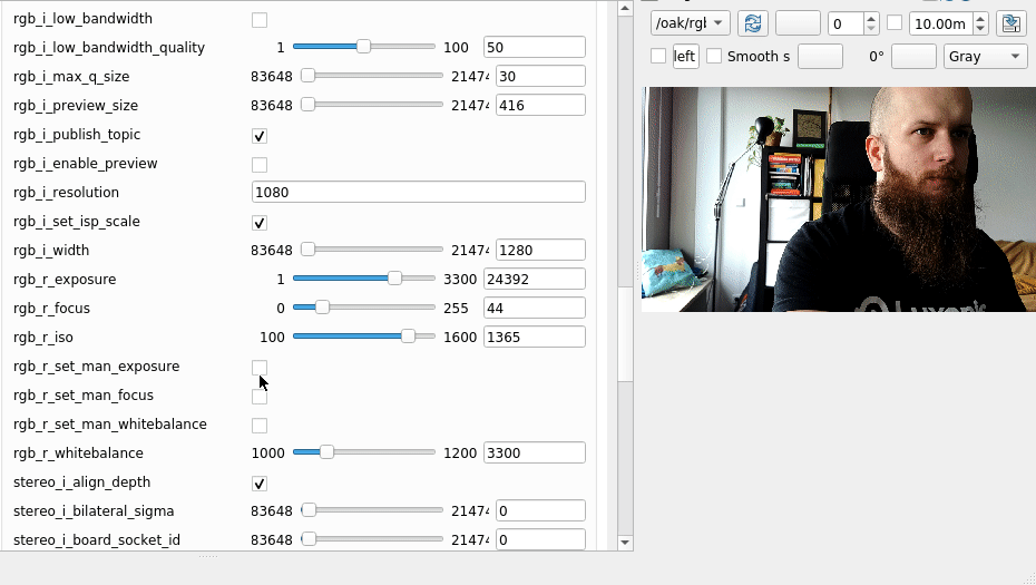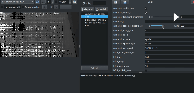 As for the parameters themselves, there are a few crucial ones that decide on how camera behaves.camera_i_pipeline_typecan be eitherRGB- only publishes RGB stream , NN availableRGBD- Publishes RGB + Depth streams (seti_publish_topicfor left and right cameras to enable them), NN & Spatial NN availableStereo- Publishes streams from left and right sensors, NN can be set for each sensor separatelyRGBStereo- Publishes RGB + Left + Right streams, NN can be set for each sensor separatelyDepth- Publishes only depth stream, NN can be set on stereo node via parameterCamArray- Publishes streams for all detected sensors, NN can be set for each sensor separatelyTof- Publishes only TOF stream, no NN availableDepthTof- Publishes Depth + TOF streams, specific to OAK-D-SR-POE, NN can be set on stereo node via parameterStereoToF- Publishes Stereo + TOF streams, specific to OAK-D-SR-POE, NN can be set on stereo node via parameterRGBToF- Publishes RGB + TOF streams, specific to OAK-D-SR-POE, NN can be set on stereo node via parameter This tells the camera whether it should load stereo components. Default set toRGBD. It is also possible to create a custom pipeline since all types are defined as plugins.