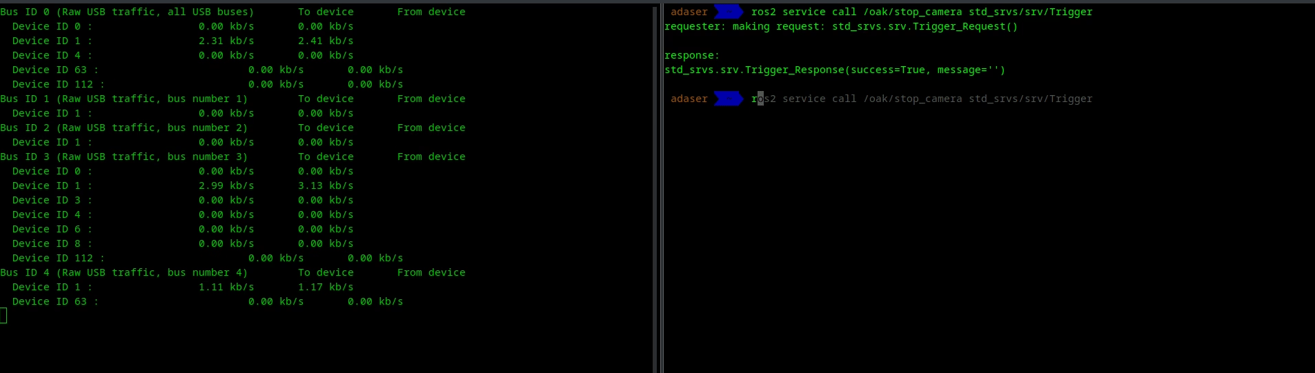 Stopping camera also can be used for power saving, as pipeline is removed from the device. Topics are also removed when camera is stopped.There is also an option to enable auto restart if camera encounters an error. To do that, set camera.i_restart_on_diagnostics_error: truePipeline parameters